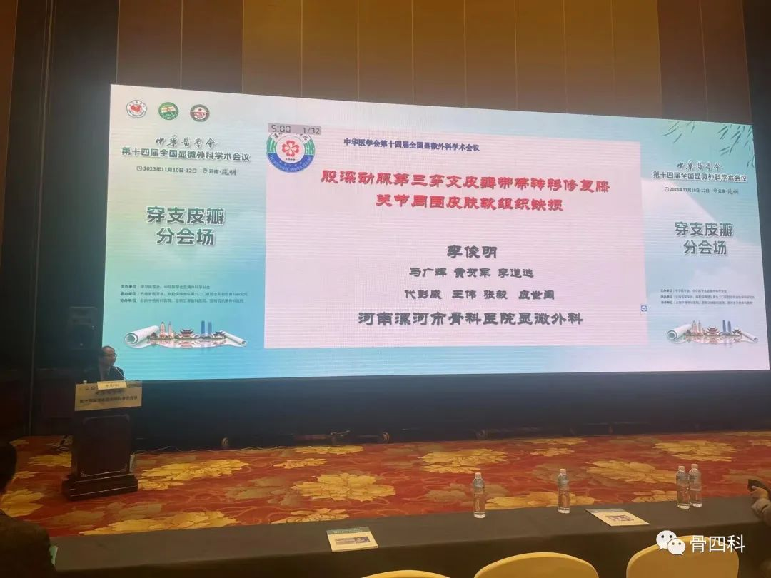 在穿支皮瓣分會(huì)場(chǎng),李俊明就《股深動(dòng)脈第三穿支皮瓣帶蒂轉(zhuǎn)移修復(fù)膝關(guān)節(jié)周?chē)つw軟組織缺損》作主題演講,并和同仁們展開(kāi)討論。