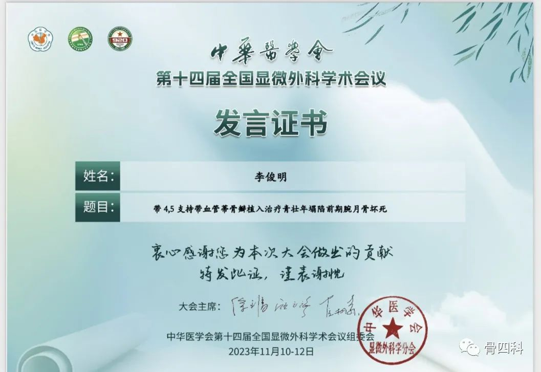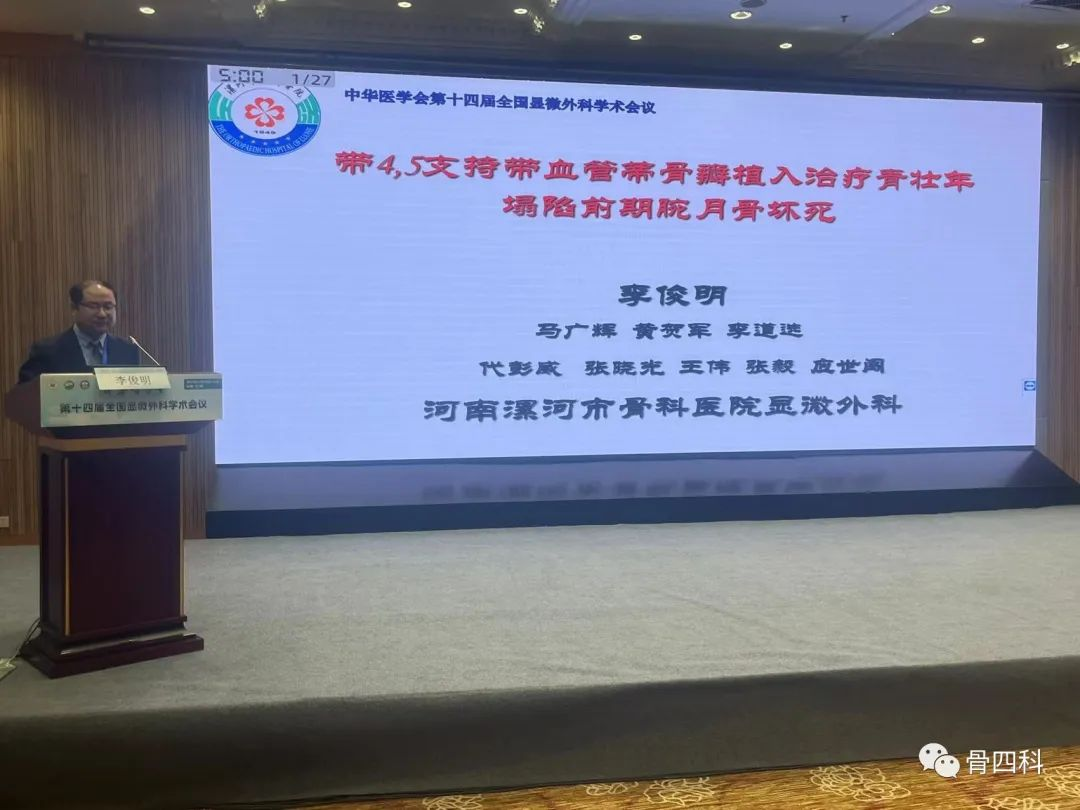 在骨顯微修復(fù)分會(huì)場(chǎng),李俊明就《帶四、五支持帶血管蒂骨瓣植入治療青壯年塌陷前期腕月骨壞死》展開(kāi)精彩發(fā)言。