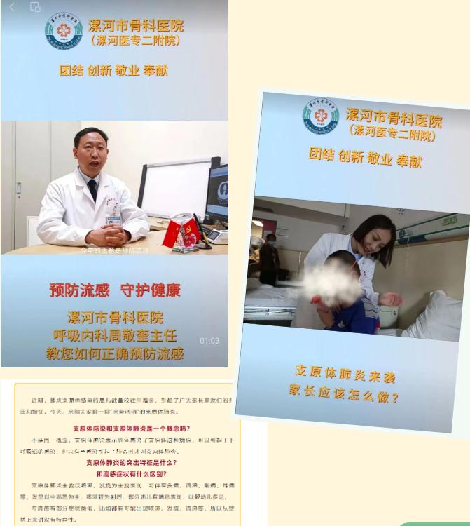 入秋以來呼吸道疾病高發(fā),醫(yī)院結合日常工作經驗,不斷加強公眾教育和健康宣傳。邀請兒科、呼吸內科等科室的多位專家錄制科普視頻,并利用視頻號、抖音號等多平臺向公眾發(fā)布健康宣教知識。同時,向各科室征集健康科普文章,通過漯河市骨科醫(yī)院微信公眾平臺及省市級媒體進行發(fā)布,多渠道向公眾普及兒童常見疾病的預防和治療知識,為支原體肺炎的預防和應急處理提供支持,提高家長們的健康意識和應對能力。