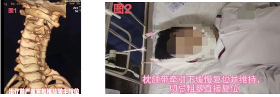 兒童寰樞椎半脫位早期治療并不復(fù)雜,關(guān)鍵時(shí)要高度重視及時(shí)就診正規(guī)治療,切勿亂投醫(yī),勿要不正規(guī)盲目簡(jiǎn)單粗暴快速手法復(fù)位。要盡早至脊柱專(zhuān)科,診斷明確后一般不需要輸液、抽血等不必要檢查,通常應(yīng)用枕頜帶(Glisson)平臥位取正中位牽引(見(jiàn)圖2),傷后2天內(nèi)盡可能持續(xù)小重量牽引,牽引過(guò)程中會(huì)緩慢糾正寰樞椎半脫位,牽引重量實(shí)用骨科學(xué)建議兒童約1.5-2kg即可,一般1-3天復(fù)位,兒童表現(xiàn)為頸部旋轉(zhuǎn)功能恢復(fù),疼痛消失??蛇M(jìn)一步復(fù)查X線或CT了解復(fù)位情況,盡可能牽引1-2周。然后可以進(jìn)一步頸托固定保護(hù)約1月為宜。治療不及時(shí)發(fā)生旋轉(zhuǎn)固定半脫位或嚴(yán)重陳舊半脫位,會(huì)導(dǎo)致頸疼、斜頸、斜視、面部不對(duì)稱(chēng),保守?zé)o效時(shí)需要手術(shù)治療。當(dāng)然我們盡可能要避免這種結(jié)局。