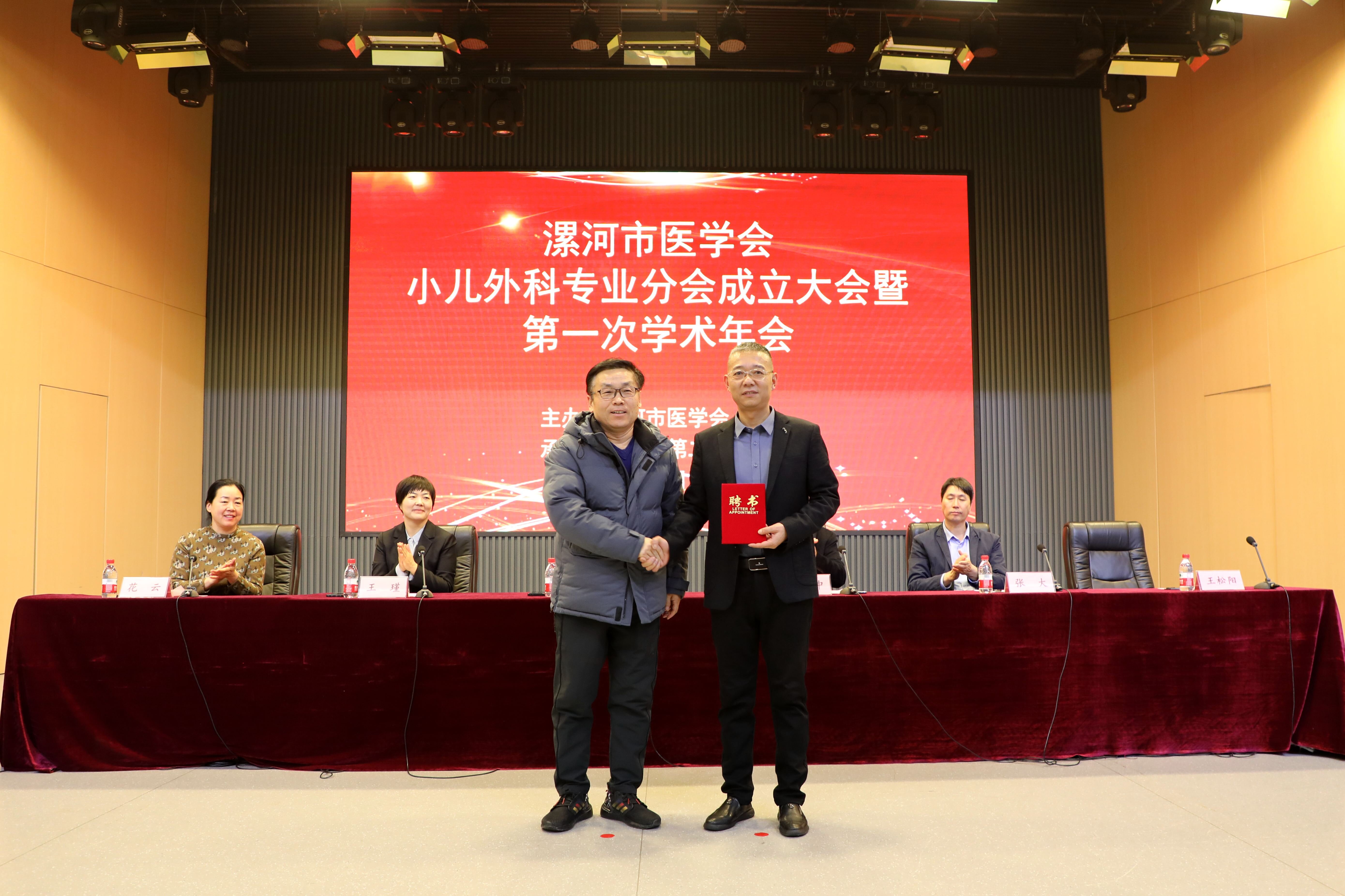 儀式現(xiàn)場(chǎng),市衛(wèi)健委二級(jí)調(diào)研員趙明陽為漯河市首屆小兒外科專業(yè)分會(huì)主任委員王松陽頒發(fā)聘書。希望小兒外科專業(yè)分會(huì)充分發(fā)揮學(xué)會(huì)橋梁紐帶作用,溝通協(xié)調(diào)好各醫(yī)院委員,拓寬思維,大膽創(chuàng)新,積極吸納相關(guān)學(xué)科的現(xiàn)代科學(xué)方法和技術(shù)手段,共同推動(dòng)漯河市小兒外科事業(yè)的整體發(fā)展。