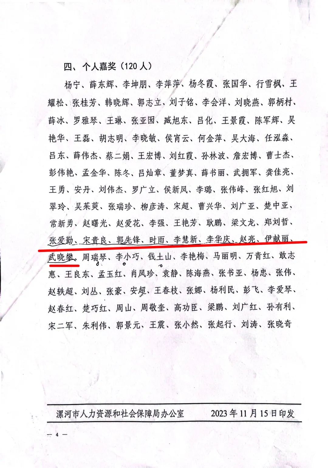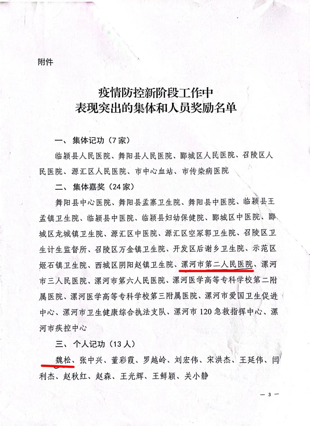 11月15日,漯河市人力資源和社會(huì)保障局對(duì)疫情防控新階段工作中表現(xiàn)突出的集體和個(gè)人進(jìn)行表彰,市二院榮獲集體嘉獎(jiǎng)獎(jiǎng)勵(lì)。