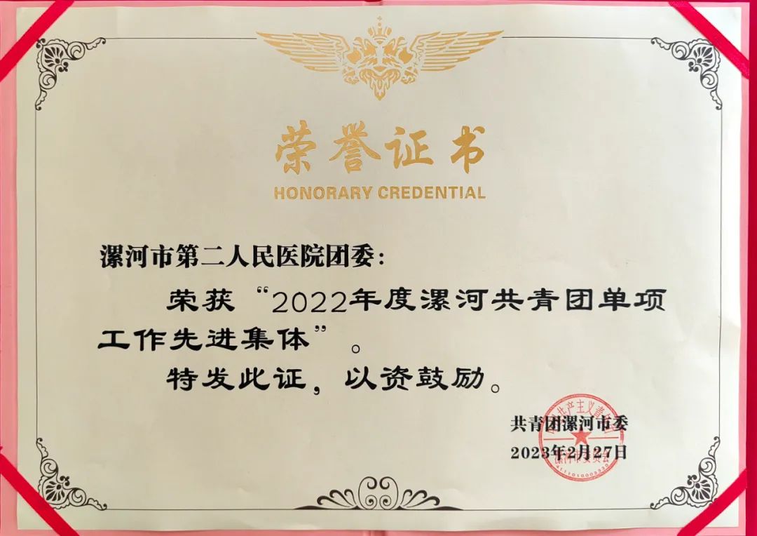 2月28日,共青團(tuán)漯河市五屆十二次全委(擴(kuò)大)會(huì)議召開(kāi),市二院團(tuán)委因志愿服務(wù)工作被表彰為“2022年度漯河共青團(tuán)單項(xiàng)工作先進(jìn)集體”。