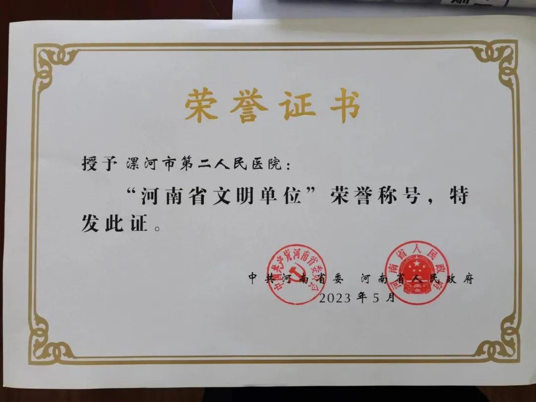 9月,中共河南省委、河南省人民政府發(fā)布《關(guān)于命名新一屆河南省文明城市文明村鎮(zhèn)文明單位文明家庭的決定》(豫文〔2023〕50號(hào)),市二院再次榮獲新一屆“河南省文明單位”榮譽(yù)稱(chēng)號(hào)。