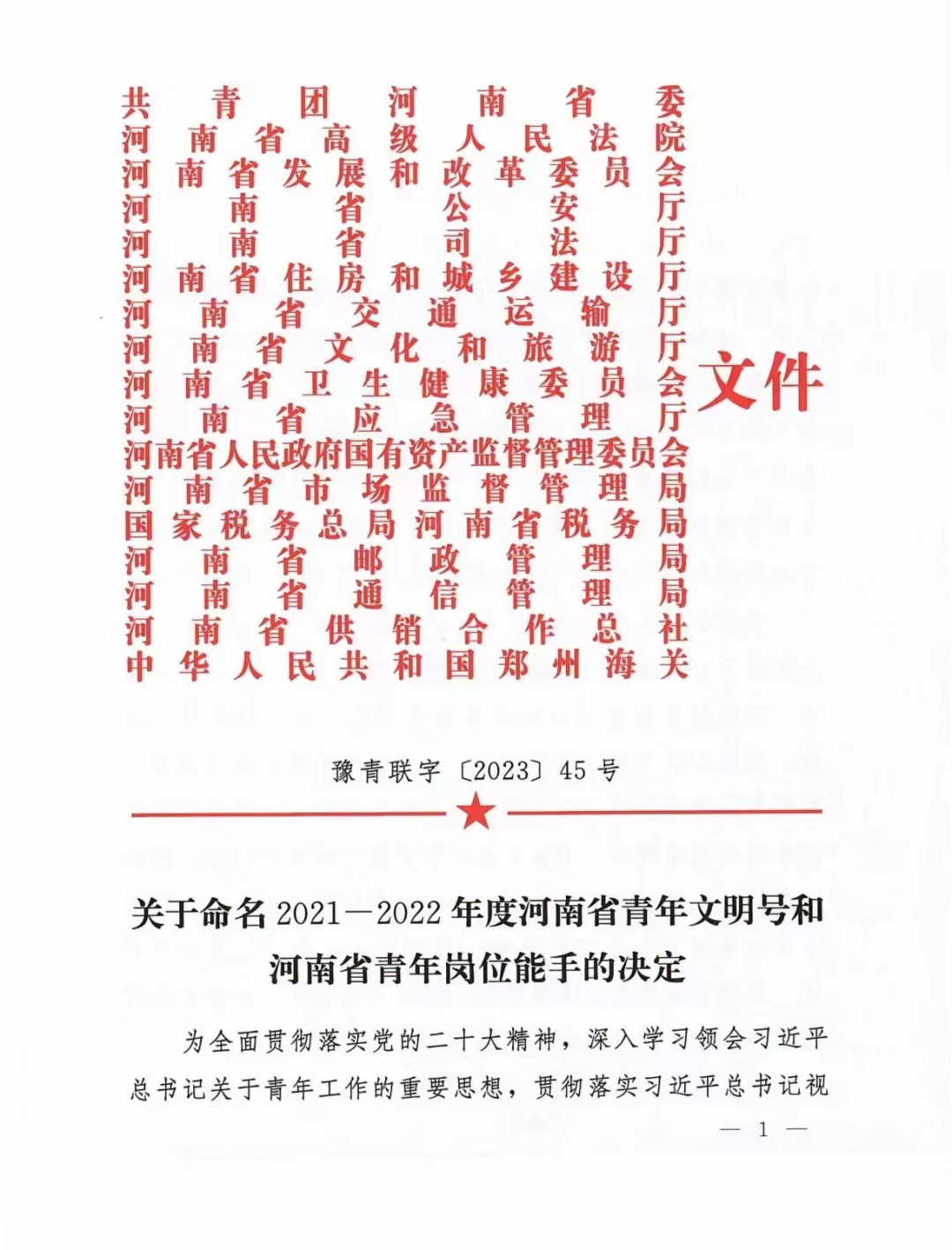 近日,共青團河南省委等部門聯合印發(fā)了《關于命名“2021-2022年度河南省青年文明號和河南省青年崗位能手”的決定》,市二院放療科被授予河南省“青年文明號”榮譽稱號。