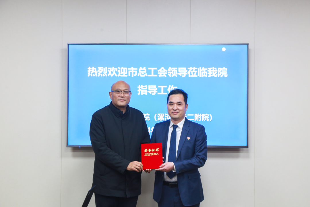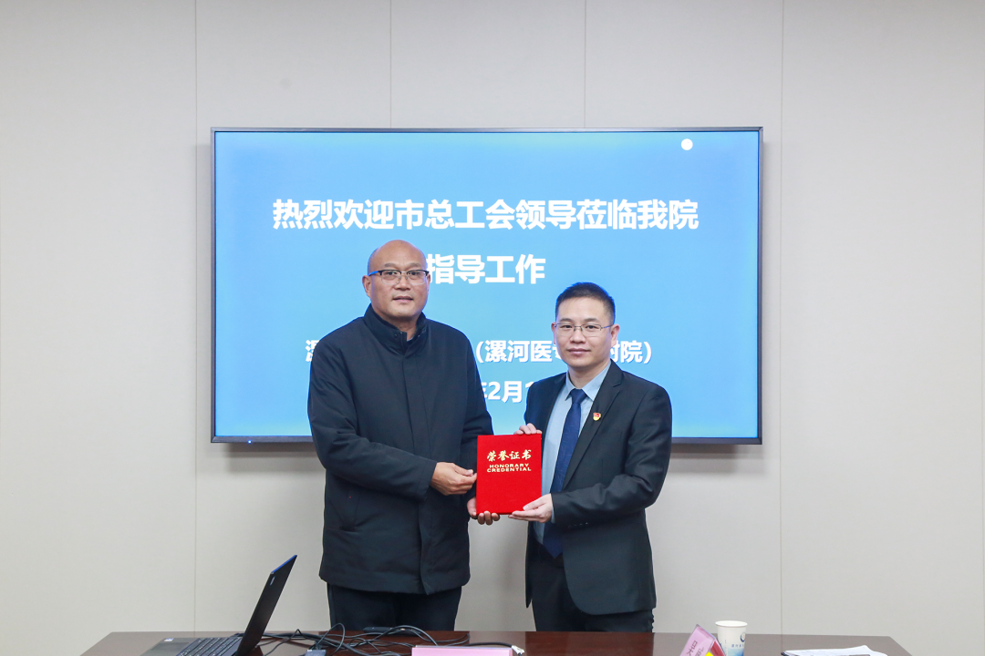 2月1日,漯河市總工會黨組成員、副主席張振凡,市總工會科教文衛(wèi)體工會主任谷賀衛(wèi)專程來院將榮譽證書送到陳小村和陳宏峰手中,勉勵他們立足本職、再接再厲,不斷提高道德水平和業(yè)務(wù)素質(zhì),為推動我市衛(wèi)生事業(yè)全面深入發(fā)展作出新的更大貢獻(xiàn)。