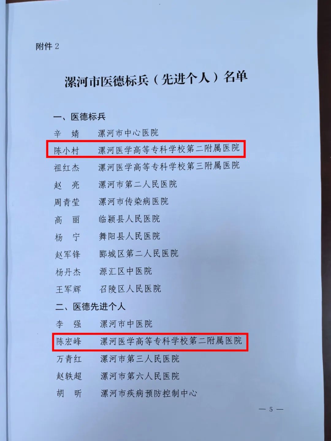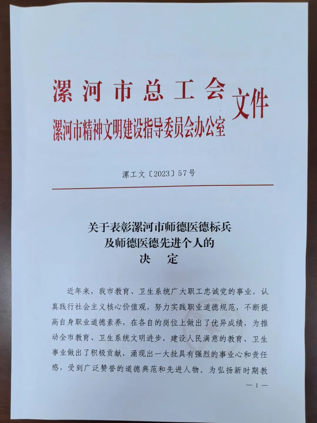 為推動全市教育、衛(wèi)生系統(tǒng)文明進(jìn)步,建設(shè)人民滿意的教育、衛(wèi)生事業(yè),進(jìn)一步激勵教育、衛(wèi)生系統(tǒng)廣大職工不斷開創(chuàng)中國式現(xiàn)代化建設(shè)漯河實踐新局面努力奮斗,近日,漯河市總工會、漯河市精神文明建設(shè)指導(dǎo)委員會辦公室聯(lián)合發(fā)布了《關(guān)于表彰漯河市師德醫(yī)德標(biāo)兵及師德醫(yī)德先進(jìn)個人的決定》,漯河市骨科醫(yī)院(漯河醫(yī)專二附院、漯河市立醫(yī)院)耳鼻咽喉科主任陳小村獲得“漯河市醫(yī)德標(biāo)兵”榮譽稱號,足踝外科主任陳宏峰獲得“漯河市醫(yī)德先進(jìn)個人”榮譽稱號。