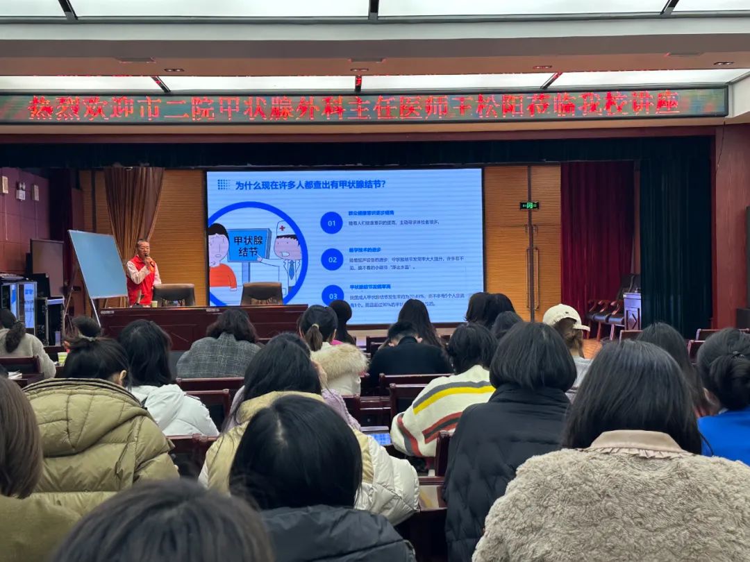 義診結(jié)束后,市二院小兒外科主任王松陽(yáng)對(duì)老師們進(jìn)行了《甲狀腺結(jié)節(jié)的誘因及防治》知識(shí)講座,詳細(xì)講解了甲狀腺疾病的常見(jiàn)類(lèi)型、甲狀腺結(jié)節(jié)的誘因、預(yù)防方法和術(shù)前術(shù)后注意事項(xiàng)等知識(shí)。