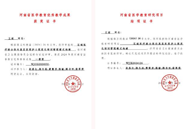 近日,河南省衛(wèi)生健康委員會下發(fā)了《關(guān)于公布2024年河南省醫(yī)學(xué)教育研究項目立項教學(xué)成果和優(yōu)質(zhì)課評選結(jié)果的通知》,由漯河市骨科醫(yī)院(漯河醫(yī)專二附院、漯河市立醫(yī)院)王瓊、趙春紅、楊冬松、曹慧芳、陳敏、韓書環(huán)、柴翠萍團隊完成的《區(qū)域醫(yī)療聯(lián)合體內(nèi)基層醫(yī)院護士規(guī)范化培訓(xùn)管理模式構(gòu)建》項目完成結(jié)項,被授予2024年河南省醫(yī)學(xué)教育優(yōu)秀教學(xué)成果一等獎。