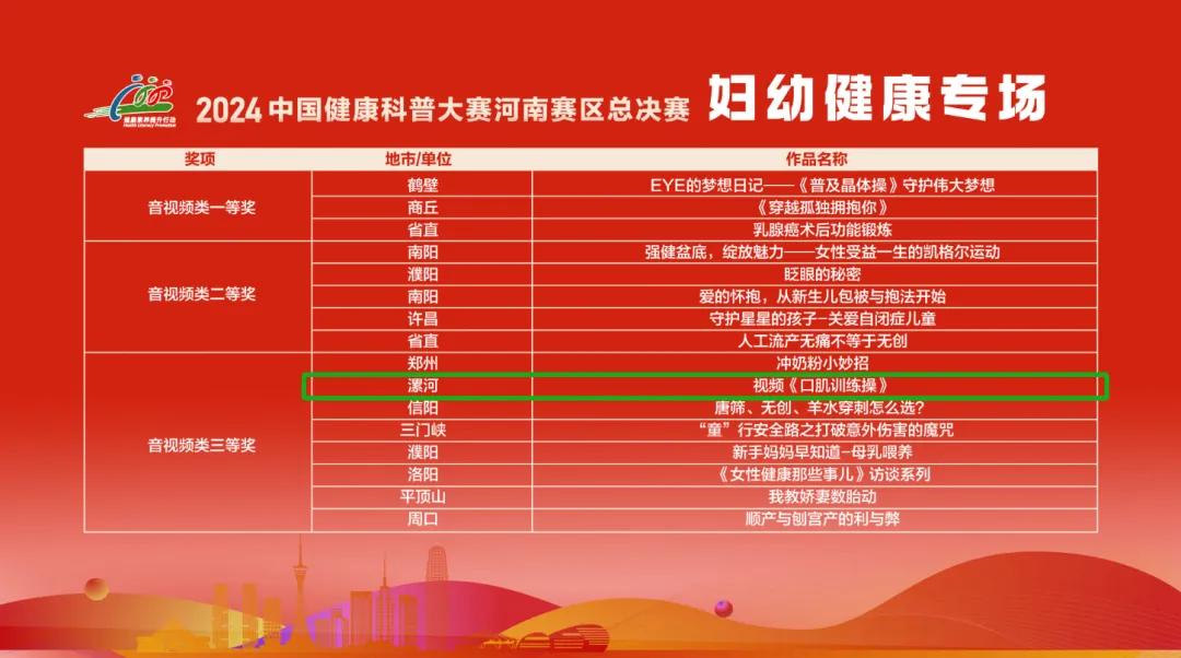 在大賽中,市二院憑借卓越表現(xiàn),原創(chuàng)作品《雙腿的控訴》獲得慢性病類作品三等獎(jiǎng)、《背包俠客》獲得婦幼健康類作品三等獎(jiǎng)、視頻作品《口肌訓(xùn)練操》獲得三等獎(jiǎng),為健康知識(shí)普及書寫了精彩篇章。