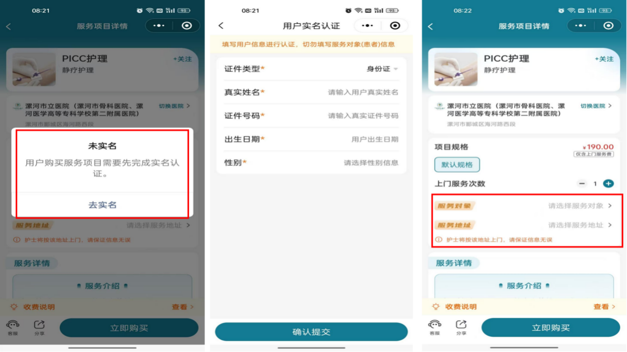 3.購買之后需實名認(rèn)證,請正確填寫各項信息,服務(wù)對象填寫的是需要被護(hù)理的患者,地址填寫準(zhǔn)確。
