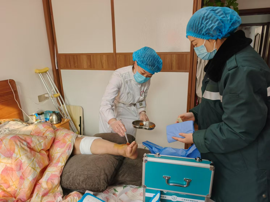 接到任務(wù)后,張燕燕護(hù)士長(zhǎng)帶領(lǐng)科室主管護(hù)師孟丹丹一起按照約定時(shí)間上門(mén)服務(wù),在對(duì)患者做了系統(tǒng)的傷口評(píng)估后,嚴(yán)格按照操作標(biāo)準(zhǔn),動(dòng)作輕柔又利落地對(duì)傷口進(jìn)行了創(chuàng)面消毒、換藥、包扎,同時(shí)耐心為患者及家屬講解了傷口居家護(hù)理的注意事項(xiàng)及患肢的功能鍛煉要點(diǎn)等。