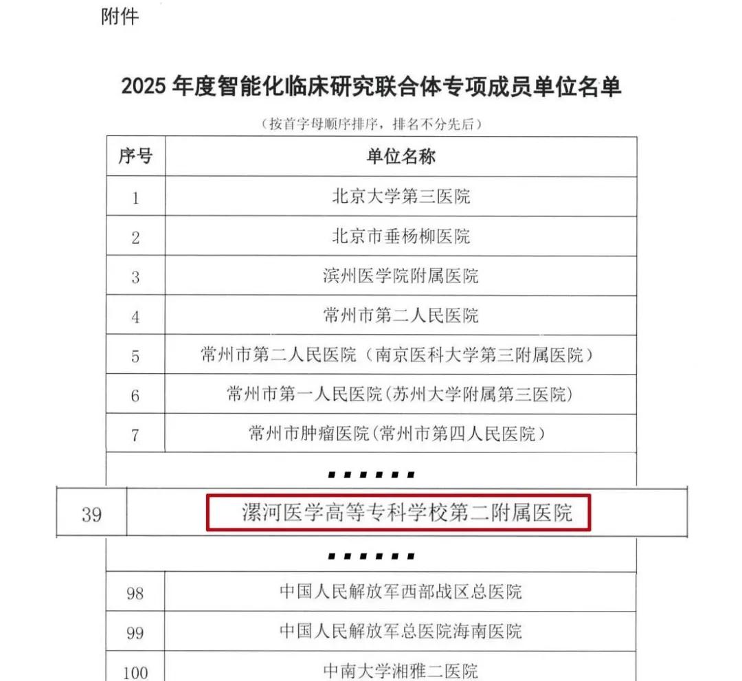 由國家骨科與運動康復臨床醫(yī)學研究中心(以下簡稱“國家臨床中心”)聯(lián)合國家藥品監(jiān)督管理局信息中心、國家臨床中心產(chǎn)業(yè)創(chuàng)新中心(常州)共同設(shè)立的“2025年度智能化臨床研究聯(lián)合體專項”已完成首批成員單位遴選,共103家單位成功入選(具體名單見文末附件),覆蓋全國26個省份。 其中漯河醫(yī)專二附院成功入選國家臨床中心“智能化臨床研究聯(lián)合體專項”首批成員單位