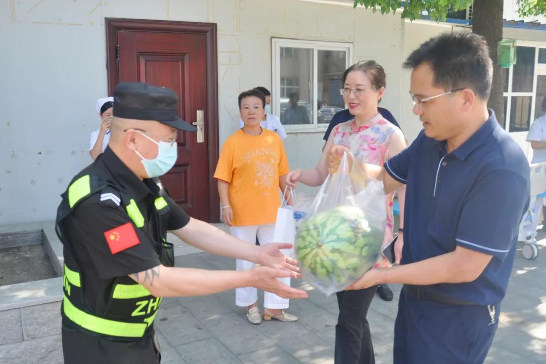 院領(lǐng)導(dǎo)帶隊(duì),工會、團(tuán)委志愿者組成慰問小組,慰問高溫酷暑中堅(jiān)守在各個(gè)崗位上的醫(yī)務(wù)、保安、保潔等工作人員。送去了包含酸梅湯、風(fēng)油精、西瓜等實(shí)用防暑降溫用品的“清涼包”。這些物品不僅能夠幫助職工在高溫環(huán)境下有效緩解暑熱燥氣,更體現(xiàn)了醫(yī)院對職工身心健康的深切關(guān)懷。