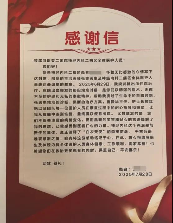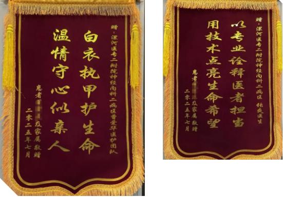 “你們不僅關(guān)注我的病情變化,更用溫暖的笑容和貼心的言語緩解了我的焦慮,讓我感受到醫(yī)者仁心的力量。”康復(fù)出院后,患者及家屬攜錦旗與感謝信再次來到醫(yī)院,他們把“以專業(yè)詮釋醫(yī)者擔(dān)當(dāng) 用技術(shù)點亮生命希望”、“白衣執(zhí)甲護生命 溫情守心似親人”這樣的贊譽送給醫(yī)護人員,表達(dá)著對醫(yī)護團隊的認(rèn)可,也彰顯了醫(yī)院多學(xué)科聯(lián)合會診機制,院前急救、院內(nèi)急診、院內(nèi)救治全流程閉環(huán)管理的顯著優(yōu)勢。