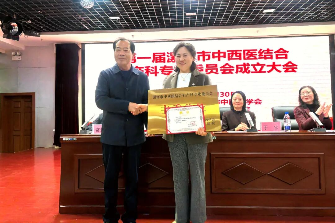 漯河市中醫(yī)藥學(xué)會(huì)理事長(zhǎng)陳來恩為漯河市中醫(yī)藥學(xué)會(huì)中西醫(yī)結(jié)合婦產(chǎn)科專業(yè)委員會(huì)的成立揭牌并給本次大會(huì)主任委員齊衛(wèi)頒發(fā)聘書。
