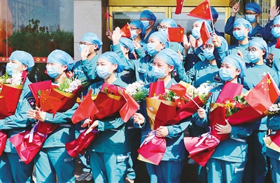 市委書記蒿慧杰在歡迎儀式上動情地說,鞭敲金蹬響,齊唱凱歌還。聽到白衣戰(zhàn)士們高唱“五星紅旗迎風(fēng)飄揚,勝利歌聲多么嘹亮”,我們更加深切地體會到,在抗擊災(zāi)難中黨的偉大、祖國的偉大、人民的偉大??吹娇挂哂率總儚淖钋把貏倮麣w來、平安到家,我們和你們的家人一樣,非常高興。我代表市委、市人大、市政府、市政協(xié)和市疫情防控指揮部,向你們以及支持你們奔赴抗疫第一線的家人表示衷心的感謝和崇高的敬意!代表全市人民為你們點贊,歡迎你們回家!