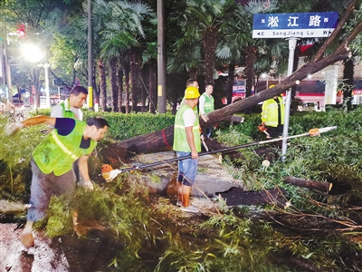 18日晚上10點(diǎn),市城管局園林綠化養(yǎng)護(hù)中心對(duì)淞江路與泰山路交叉口的倒伏樹木進(jìn)行清理。