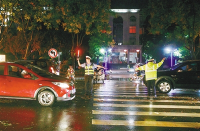 強(qiáng)降雨導(dǎo)致交通擁堵,交警也延長(zhǎng)了執(zhí)勤時(shí)間。圖為18日晚上9點(diǎn),洪河路與嵩山路交叉口,交警在路上疏導(dǎo)交通。