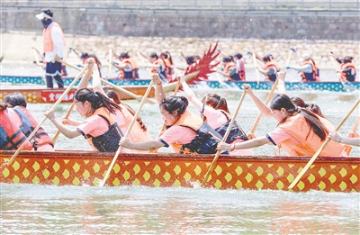 上午10點(diǎn)半,比賽正式開始,一條條龍舟在鼓聲中如離弦之箭,向終點(diǎn)駛?cè)?。選手們齊心協(xié)力,動作整齊劃一,水面上槳板翻飛。一條條龍舟如同一條條游龍?jiān)隈Y騁,令現(xiàn)場觀眾群情激奮。