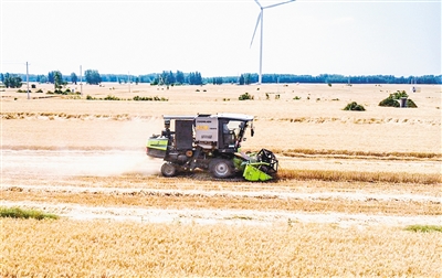 5月23日,舞陽縣辛安鎮(zhèn)花張村附近麥田內(nèi),收割機(jī)正在收割小麥。王 尊