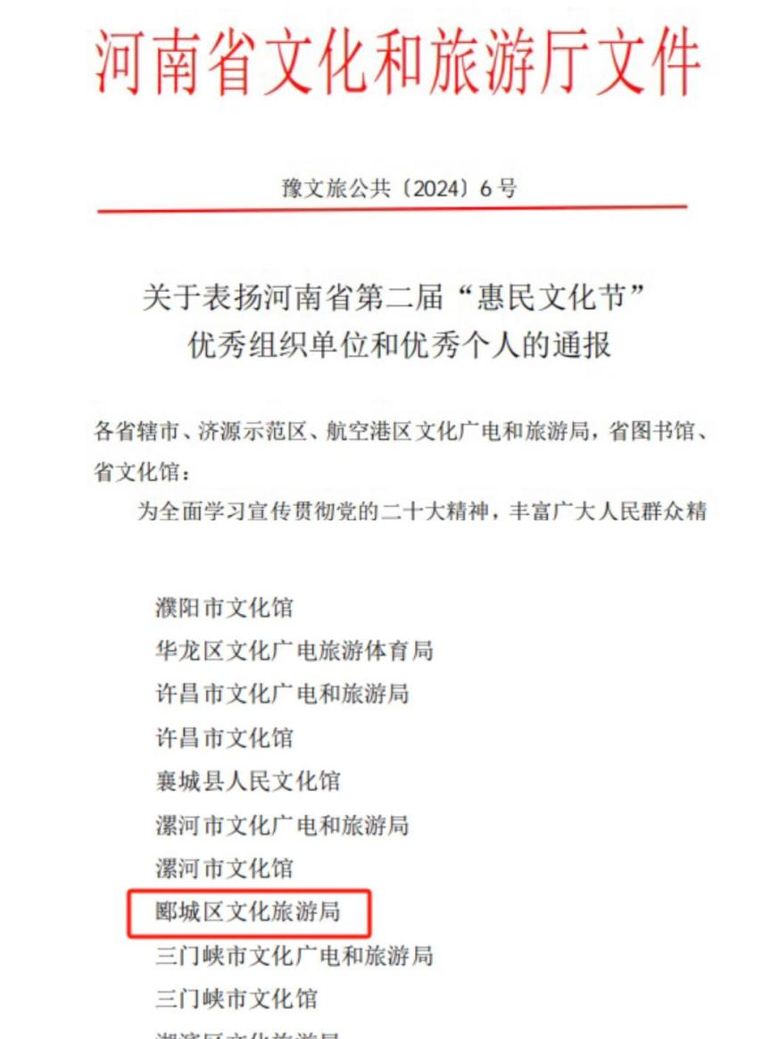 近期,在河南省文化和旅游廳公布的《關(guān)于表?yè)P(yáng)河南省第二屆“惠民文化節(jié)”優(yōu)秀組織單位和優(yōu)秀個(gè)人的通報(bào)》中,郾城區(qū)文化旅游局獲優(yōu)秀組織獎(jiǎng),局黨組書(shū)記、局長(zhǎng)李小青榮獲“優(yōu)秀個(gè)人”稱(chēng)號(hào),這既是對(duì)郾城區(qū)惠民文化工作的充分肯定和贊揚(yáng),更是對(duì)今后文化工作的鼓勵(lì)與鞭策。