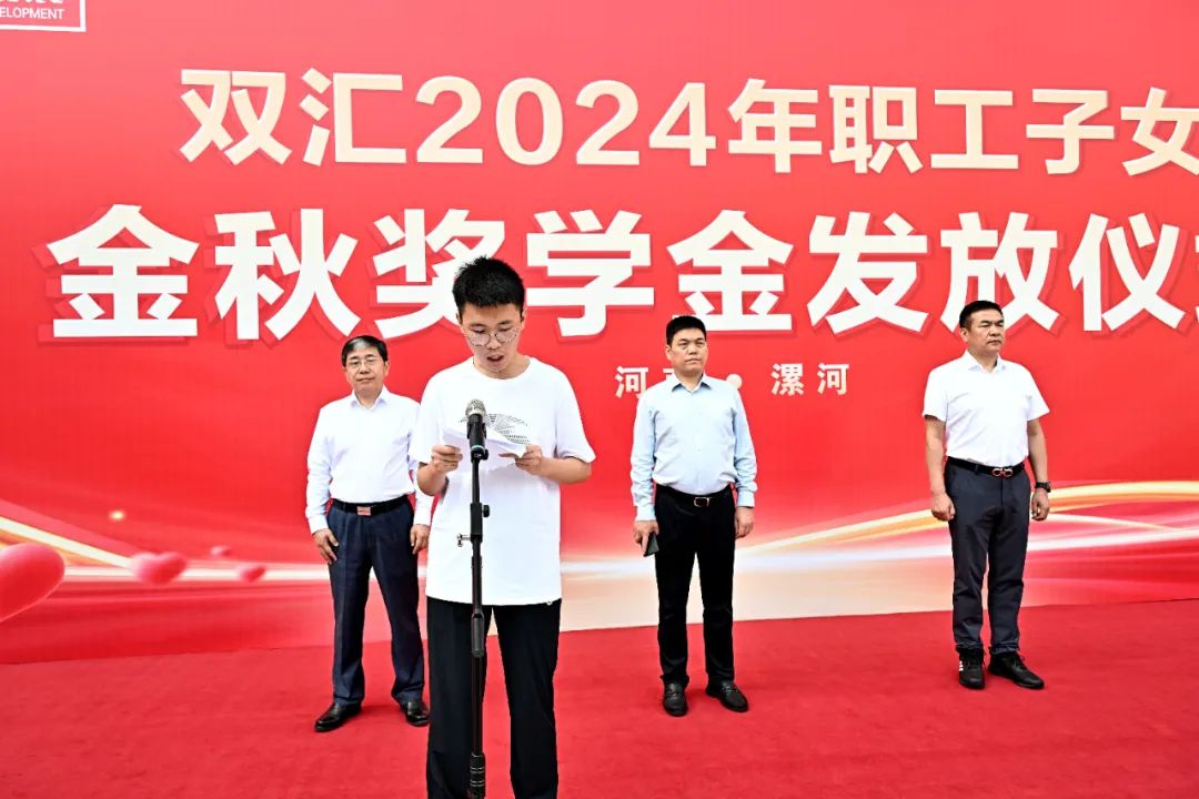 雙匯職工代表薛志良上臺(tái)發(fā)言,他表示,企業(yè)對職工子女的關(guān)心和支持,讓大家深感暖心,也倍受激勵(lì),并號(hào)召大家繼續(xù)發(fā)揚(yáng)“優(yōu)質(zhì)、高效、拼搏、創(chuàng)新”的企業(yè)精神,為企業(yè)的偉大征程蓄力添彩。