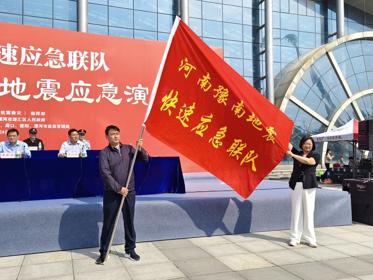 演練結束,漯河市防震減災中心主任閆秋霞與周口市應急保障中心主任袁志勇進行了豫南地震快速應急聯(lián)隊旗幟交接。