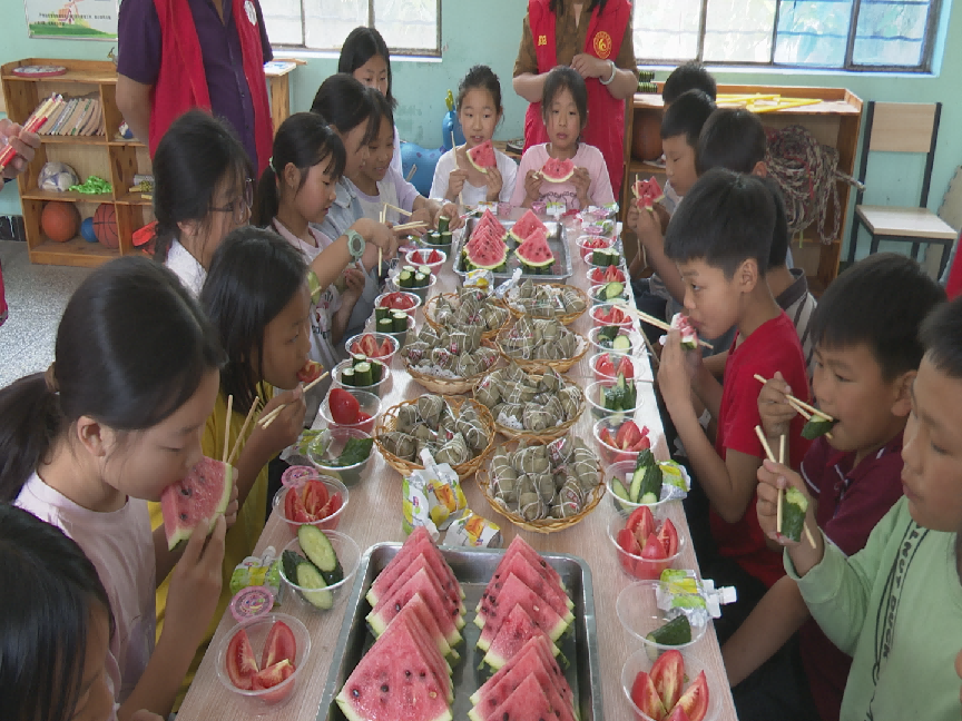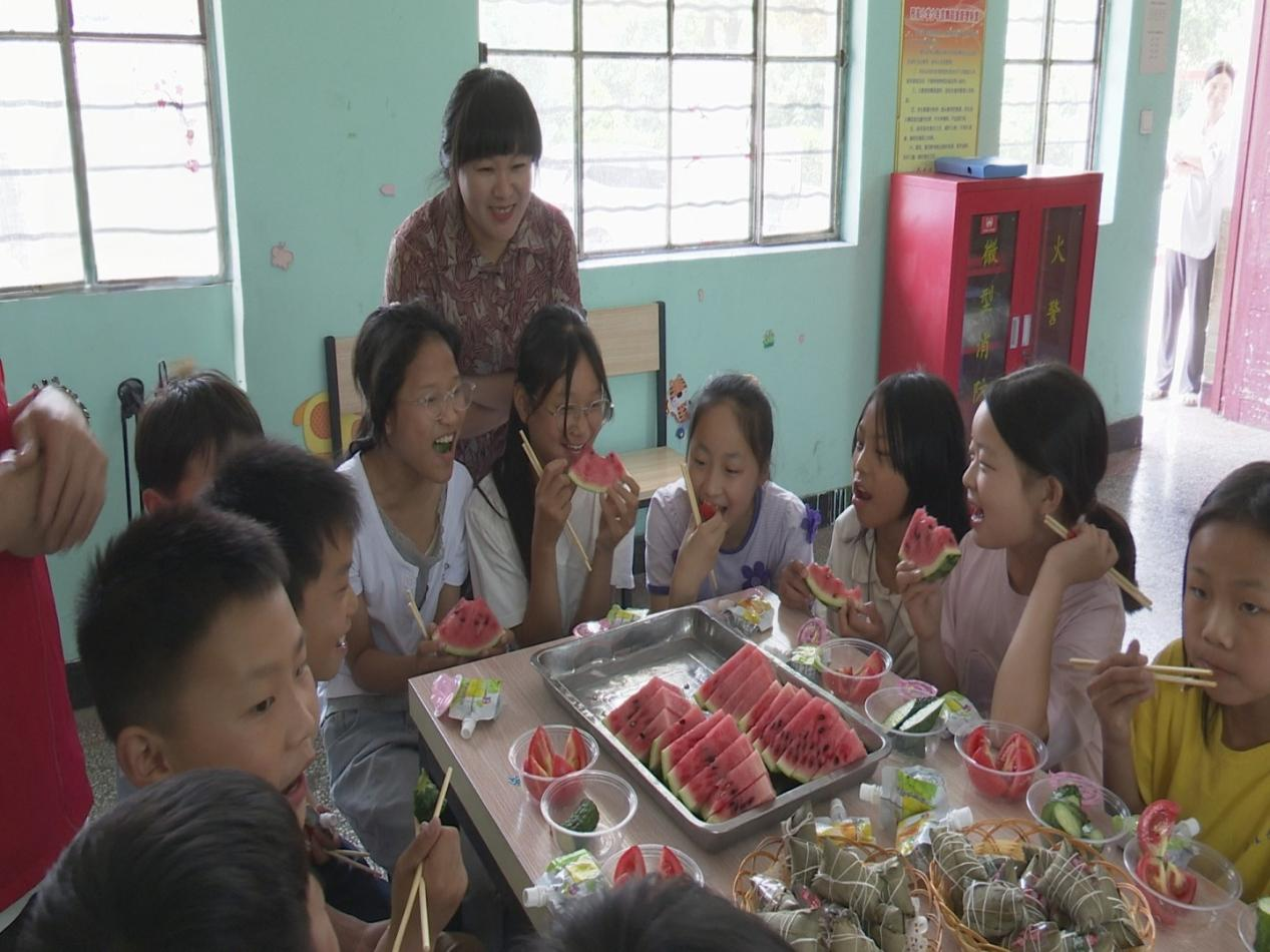 在三家店鎮(zhèn)高宗寨村兒童之家,鎮(zhèn)村干部們一早便忙活開來。他們精心準備了粽子、果凍,將鎮(zhèn)內特色農產品西紅柿、黃瓜、西瓜洗凈切片,撒上白糖,制成飽含愛意的美食?;顒蝇F(xiàn)場,孩子們圍坐在一起,伴隨著稚嫩的童聲合唱《小星星》,品嘗著酸甜可口的西紅柿、清爽多汁的果蔬拼盤和軟糯香甜的粽子,歡聲笑語此起彼伏。"太好吃啦!紅紅的西紅柿、圓圓的大西瓜、脆脆的黃瓜,還有甜甜的粽子,比我以前吃過的都好吃!我太喜歡了",高宗寨小學學生宋夢凡開心地分享著感受。鎮(zhèn)村干部們一邊與孩子們品嘗美食,一邊親切詢問學習生活情況,用實際行動傳遞溫暖關懷。