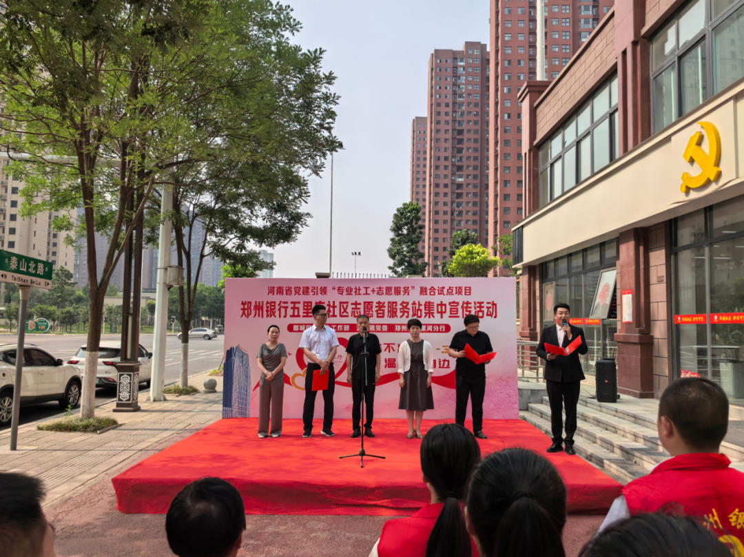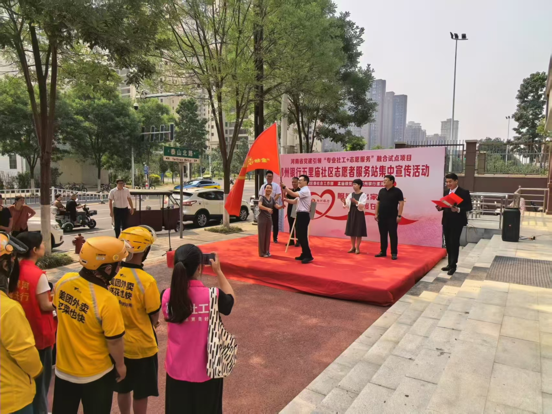 5月29日上午,河南省黨建引領“專業(yè)社工+志愿服務”融合試點項目——鄭州銀行五里廟社區(qū)志愿服務站集中宣傳活動在孟廟鎮(zhèn)五里廟黨群服務中心舉行。市委社會工作部副部長苗發(fā)勇、郾城區(qū)委常委、政法委書記馮小利等相關領導與社區(qū)志愿者、新就業(yè)群體代表、居民代表等齊聚一堂,共同見證社區(qū)治理創(chuàng)新實踐新起點。