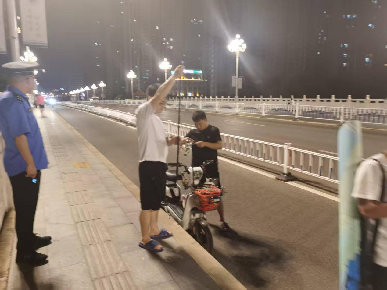 “晚上橋面光線不好,來回過往的行人和非機(jī)動(dòng)車輛也多,您在這兒垂釣實(shí)在是不安全啊,趕快收竿回家吧。”8月3日20時(shí)許,在漯河市金山路沙河橋上,經(jīng)開區(qū)城市管理綜合行政執(zhí)法大隊(duì)大隊(duì)長(zhǎng)曹陽帶領(lǐng)夜間執(zhí)法人員在轄區(qū)范圍內(nèi)開展橋面垂釣治理行動(dòng)。