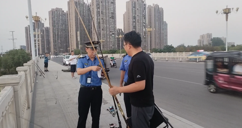 城管隊(duì)員對(duì)占用橋面違規(guī)釣魚者進(jìn)行處罰