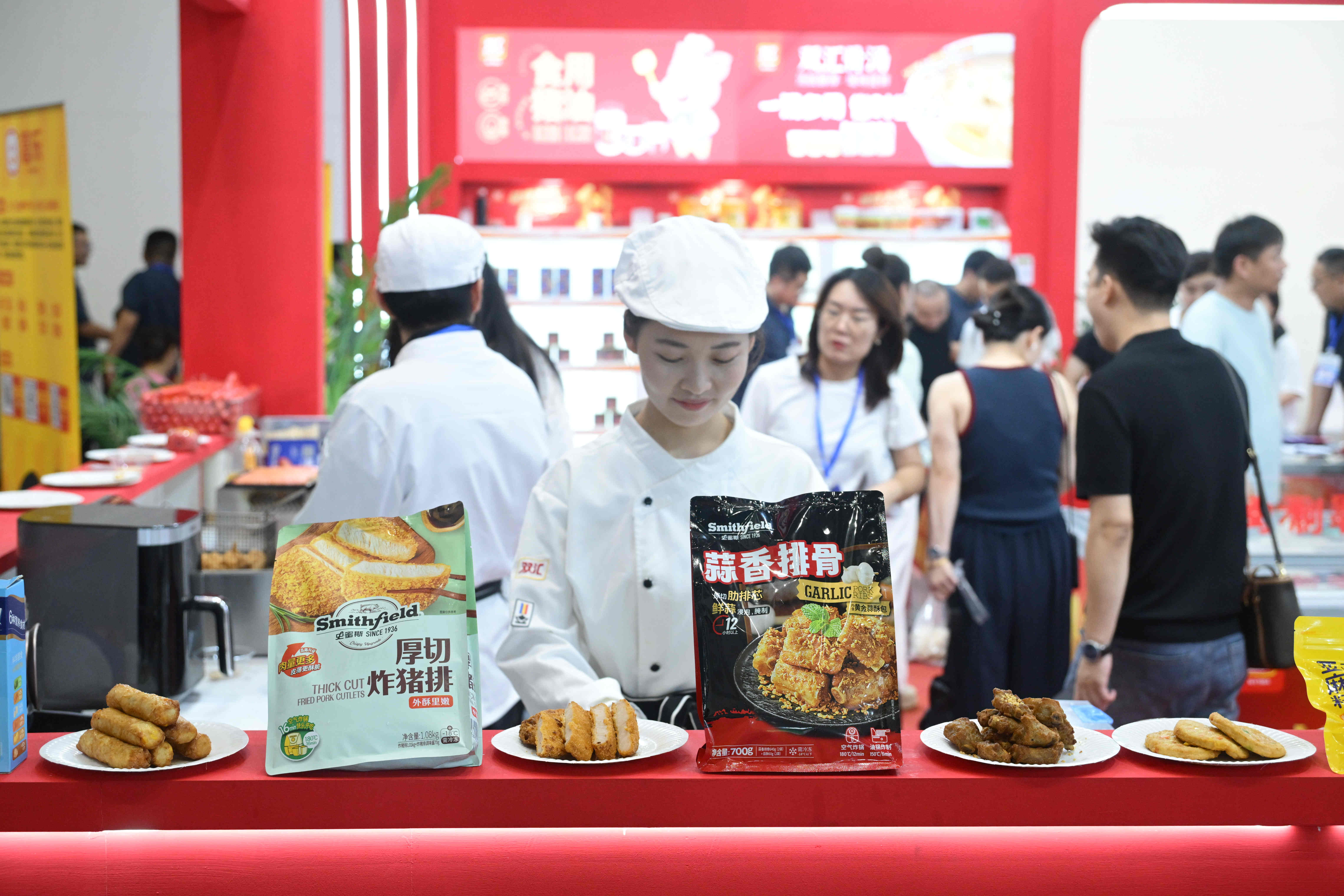 展柜內(nèi),Berlinka早餐肉蔬卷、極菲牛排、超值培根、炸豬排、亞麻籽雞肉餅、熱狗腸等特色產(chǎn)品,蒜香排骨、醬香肥腸、酸菜魚、豬肚雞等菜肴系列,香煎雞排、香酥雞塊、奧爾良風(fēng)味雞翅中、雞肉洋蔥圈等調(diào)理雞產(chǎn)品,丸子、肉卷、小酥肉、親親腸、芝士脆皮腸等火鍋食材,也充分展現(xiàn)了雙匯在產(chǎn)品創(chuàng)新方面的全新探索。