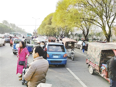 下午3時(shí)10分左右,記者在海河路西段的郾城實(shí)驗(yàn)中學(xué)門(mén)前看到,道路南側(cè)的機(jī)動(dòng)車(chē)道上停放著許多電動(dòng)車(chē)、三輪車(chē),僅留下一條行車(chē)道。校門(mén)口對(duì)面的道路北側(cè)也停放著一些接孩子的車(chē)輛。由于剩下的道路較窄,給需要在此處調(diào)頭的車(chē)輛帶來(lái)了困難,司機(jī)通常要來(lái)回倒好幾次才能成功,體型較大的公交車(chē)更是通行困難。隨著放學(xué)時(shí)間的臨近,接孩子的家長(zhǎng)越來(lái)越多,一些家長(zhǎng)直接將車(chē)停在了道路中間。