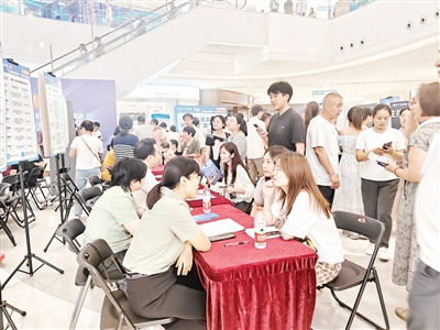 家長(zhǎng)帶著孩子來了、年輕夫妻攜手來了、剛畢業(yè)的大學(xué)生來了……求職者及其同行者像逛街一樣,穿梭于各展位間,駐足詢問、投遞簡(jiǎn)歷。