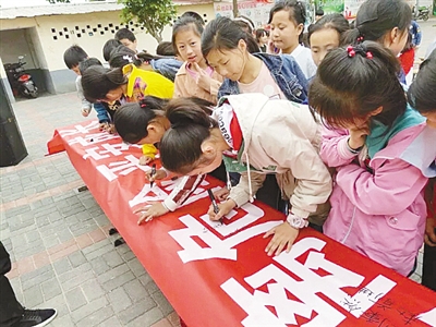 志愿者用一個個實例、一組組數(shù)據(jù),向?qū)W校師生和家長講解防溺水安全知識,提醒學(xué)生們“遠離危險水域”。隨后,全校師生一起莊嚴宣誓:珍愛生命,預(yù)防溺水,遠離危險,平安成長。學(xué)生們還認真地在紅色條幅上簽名,表達“絕不一個人下水游泳”的決心。