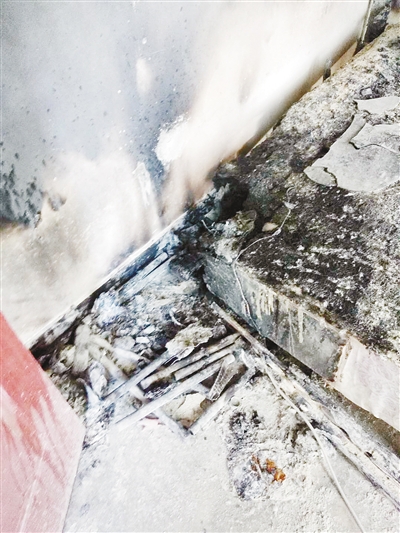 5月23日,接到消息后,記者立即來到金域藍(lán)灣小區(qū)失火居民家中,看到失火的臥室一片狼藉,屋里的家具和墻壁被熏得黑乎乎的,窗簾掉落在地上,兩塊窗戶玻璃也因高溫而炸裂。被燒焦的被子上,還有一根黑乎乎的手機(jī)充電線。