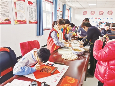 活動(dòng)開(kāi)始前,社區(qū)共建單位漯河市實(shí)驗(yàn)中學(xué)的老師和學(xué)生們進(jìn)行了寫(xiě)春聯(lián)、送春聯(lián)活動(dòng),社區(qū)志愿者則在一旁包餃子。