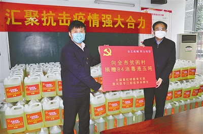(記者 齊 放)2月6日,在漯河醫(yī)專(zhuān),口腔醫(yī)學(xué)系學(xué)生黨支部把5噸84消毒液送到全市75個(gè)貧困村駐村第一書(shū)記代表手中。