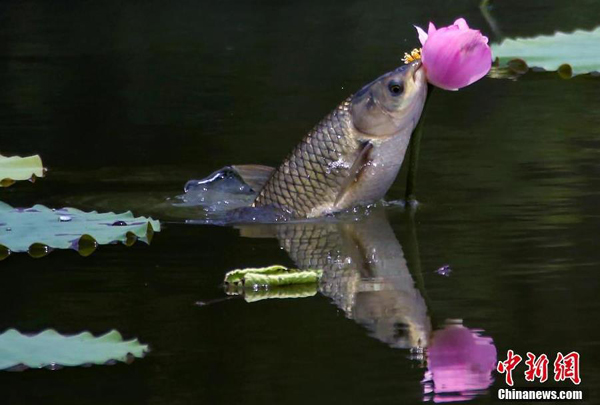 7月3日,在成都工業(yè)學(xué)院一荷塘里上演“魚吃荷花”景觀,魚兒圍繞荷花游動(dòng),不時(shí)地躍出水面撕咬荷花,場面生動(dòng)有趣。中新社記者 王磊 攝