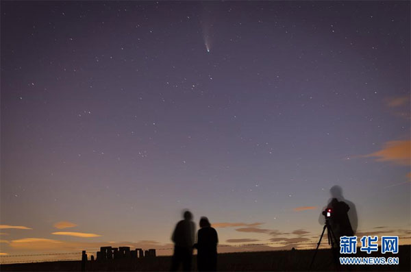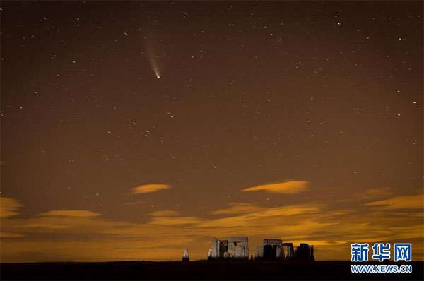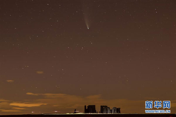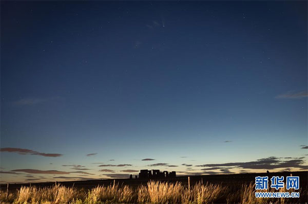 7月23日,在英國英格蘭威爾特郡的巨石陣,新智彗星劃過天際。 新智彗星是一顆長周期彗星。根據(jù)此前的觀測計算,其公轉(zhuǎn)周期為4400年。但它經(jīng)過近日點后,受太陽引力和大行星引力影響軌道發(fā)生改變,公轉(zhuǎn)周期變?yōu)?800年。 新華社發(fā)(蒂姆·愛爾蘭攝)
