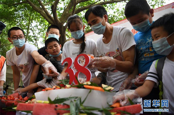 8月16日,參加“新星”38歲生日會的大熊貓“粉絲”在協(xié)助動物園工作人員制作水果生日蛋糕。 當(dāng)日,世界現(xiàn)存最年長圈養(yǎng)大熊貓“新星”迎來38歲生日,重慶動物園為“老壽星”舉行了生日會。“新星”的年齡相當(dāng)于人類的110至150歲,目前身體狀況良好。 大熊貓“新星”1982年出生于四川寶興縣野外,1983年來到重慶動物園。 新華社記者 唐奕 攝