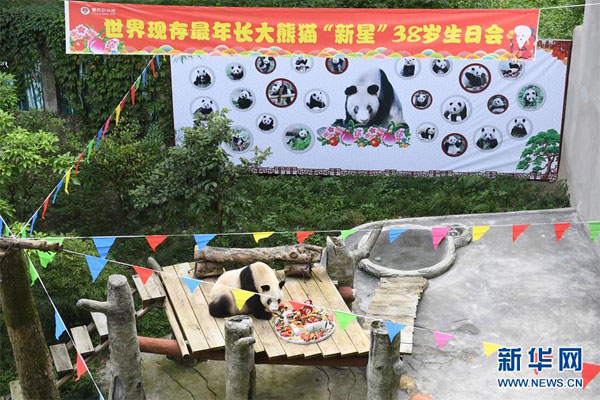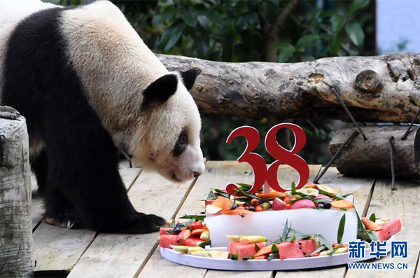 8月16日,大熊貓“新星”在38歲生日會上享用水果生日蛋糕。 當(dāng)日,世界現(xiàn)存最年長圈養(yǎng)大熊貓“新星”迎來38歲生日,重慶動物園為“老壽星”舉行了生日會。“新星”的年齡相當(dāng)于人類的110至150歲,目前身體狀況良好。 大熊貓“新星”1982年出生于四川寶興縣野外,1983年來到重慶動物園。 新華社記者 唐奕 攝