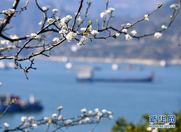 湖北省宜昌市秭歸縣長江岸邊山花開放(2月19日攝)。