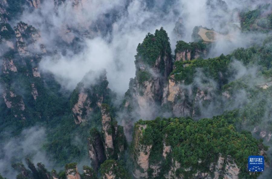 當(dāng)日,雨后的湖南張家界武陵源,云霧飄蕩在峰林之間,若隱若現(xiàn),美不勝收(無(wú)人機(jī)照片)。新華社發(fā)(吳勇兵 攝)