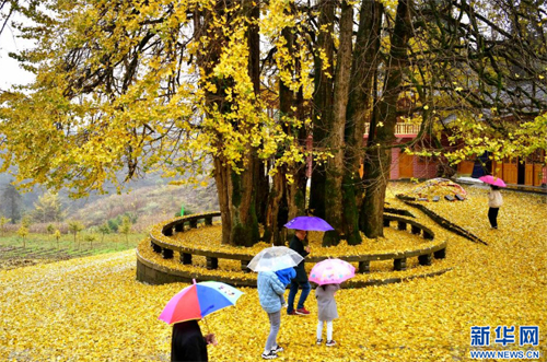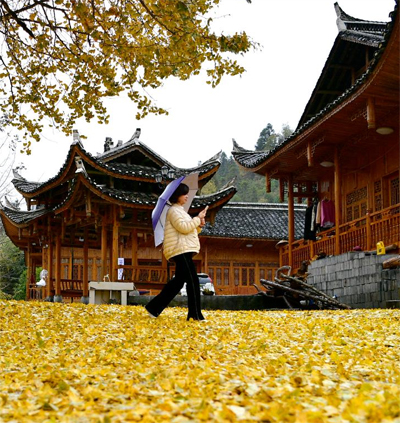 11月8日,游人在湖北省宣恩縣珠山鎮(zhèn)東門關(guān)村農(nóng)家院落前的古銀杏樹(shù)下游玩。