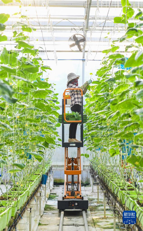 9月22日,在海南省陵水現(xiàn)代農(nóng)業(yè)示范基地,工人為黃瓜苗吊蔓。