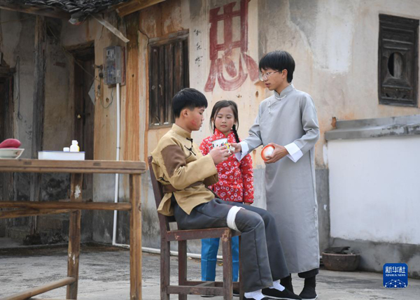 在廣東梅州大埔縣青溪鎮(zhèn)的紅色遺址棣萼樓,當?shù)貙W生參與沉浸式研學活動,演繹地下交通員的故事(1月9日攝)。