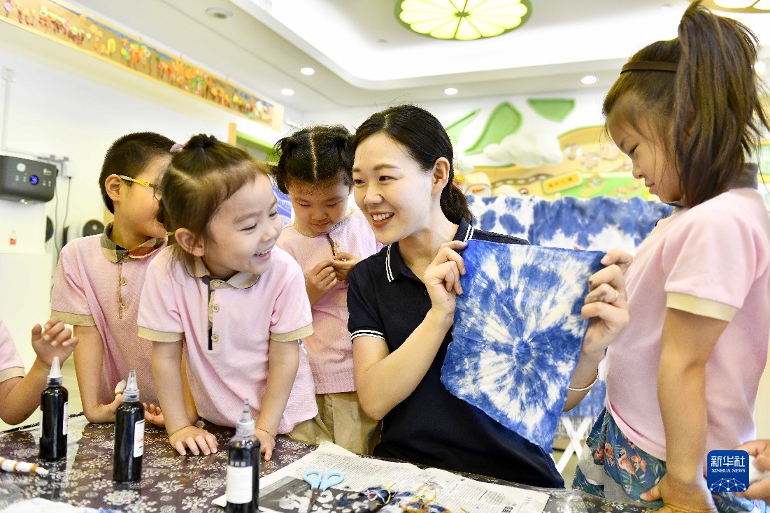 5月30日,在山東省實驗幼兒園,老師帶著孩子們體驗扎染技藝。新華社記者 郭緒雷 攝