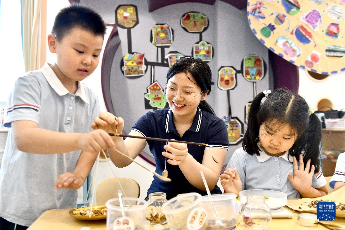 5月30日,在山東省實驗幼兒園,老師帶著孩子們體驗香囊制作。新華社記者 郭緒雷 攝